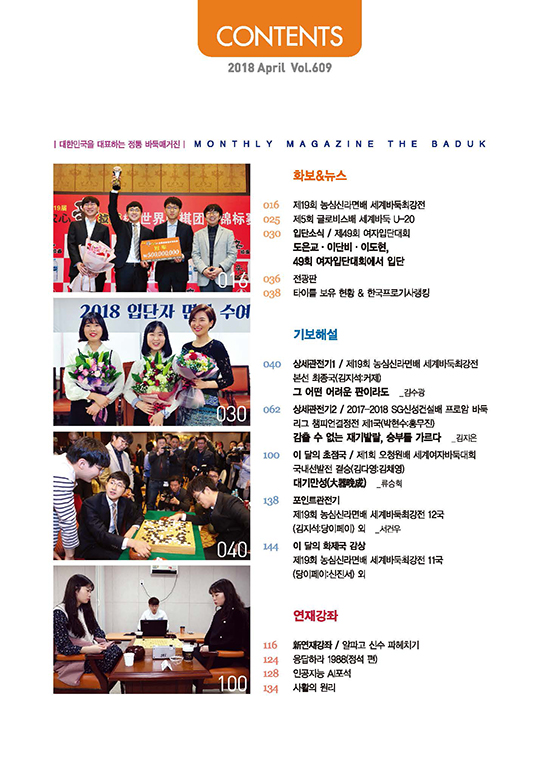 이밖에도 권효진의 [중국 바둑이야기], 남치형의 [일본 바둑사] 등 다채로운 칼럼과 연재강좌 [특강/알파고 신수 파헤치기], [사활의 원리], [응답하라 1988 정석편], [인공지능 AI포석] 등 알찬 강좌가 독자 여러분을 찾아간다.
