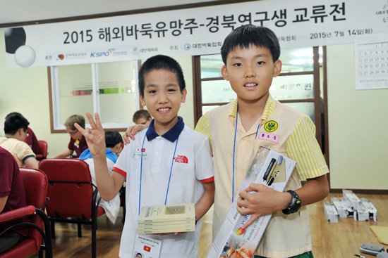 ‘2015 외국바둑유망주 초청사업’을 통해 국내바둑도장(키바글로벌에듀)에서 바둑 공부 중인 외국바둑유망주 12명과 경북연구생 12명의 친선교류전이 7월 14일(화) 경상북도바둑협회에서 개최됐다. 이번 교류전은 외국바둑유망주에게 한국바둑유망주와의 교류와 한국바둑문화를 체험할 수 있는 기회를 제공하고자 진행됐다.