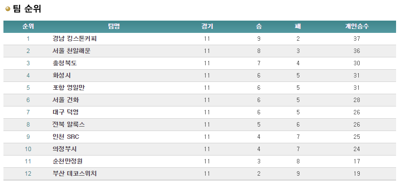 경남 킹스톤커피는 마지막 11라운드에서 순천만정원을 맞아 5전 전승으로 최종 9승 2패를 기록해 정규리그 우승을 차지했다. 10라운드까지 선두를 달리던 서울 천일해운은 인천SRC에 덜미를 잡혀 8승 3패를 기록하며 2위로 마감했다.