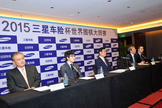 ▲대회 공식 기자회견 장면. 왼쪽부터 요다 노리모토 9단, 김지석 9단, 삼성화재 홍승표 중국 법인장, 중국위기협회 화이강 부주석, 구리 9단