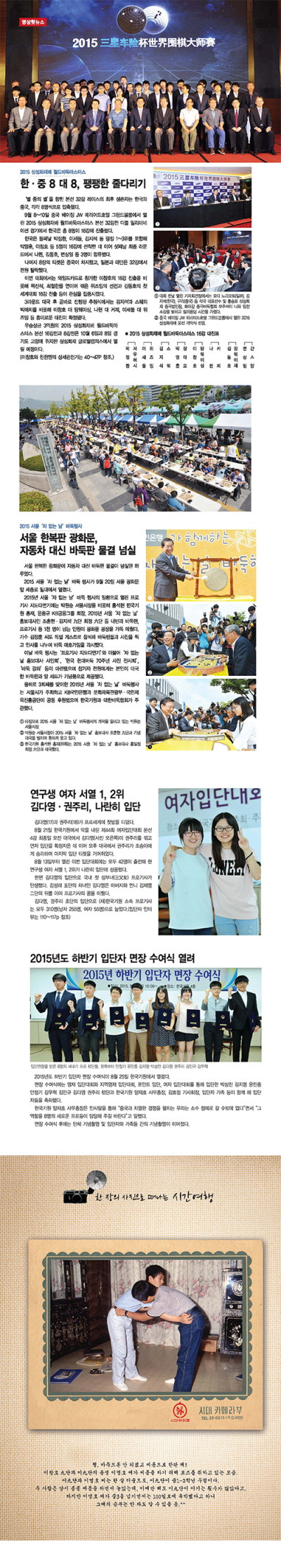 영상화보에서는 다시 시작된 ‘별들의 전쟁’ 삼성화재배 32강전의 치열한 대회 현장을 비롯해 천여판의 프로기사 지도다면기가 광화문거리를 수놓은 서울 ‘차 없는 날’ 행사의 이모저모와 TV바둑아시아선수권전, 몽백합배 세계바둑오픈전 16강, 8강 소식 등을 다채로운 화보로 만날 수 있다.