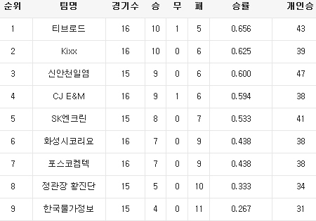 2015 KB국민은행 바둑리그 팀 순위(10월 3일 오전 8시 현재)