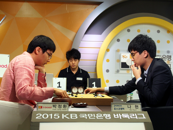 ▲박정환 9단(왼쪽)이 나현 6단을 꺾고 티브로드의 정규시즌 3연속 우승을 확정지었다