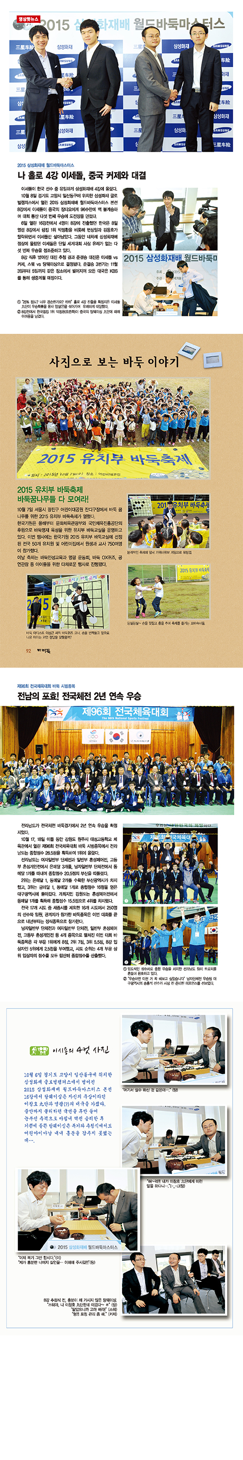 또한 이세돌의 나홀로 4강 진출로 끝난 삼성화재배 본선 16강, 8강전을 비롯해 2년 연속 우승컵을 안은 오카게배 국제신예대항전과 시니어를 가볍게 제압한 아가씨들의 지지옥션배 우승, 마지막 시범종목으로 치러진 전국체전 소식 등을 생생한 영상화보로 조명했다.