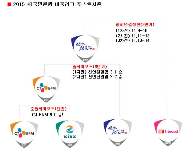 티브로드는 정규리그에서 10승 1무 5패로 1위를 기록해 챔피언결정전에 직행했고, 10승 6패로 2위를 기록한 신안천일염은 플레이오프에서 CJ E&을 2-0으로 완파하며 챔피언결정전에 합류했다.