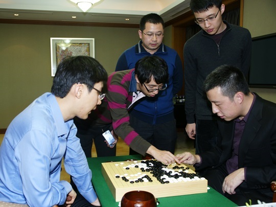 국후 중국팀 단장과 선수들이 복기에 합류해 의견을 나누고 있다.