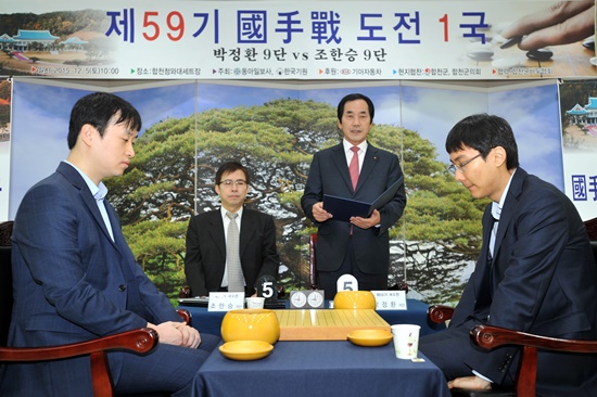 國手 박정환 9단과 도전자 조한승 9단의 리턴매치로 열린 제59기 국수전 도전 5번기 제1국은 5일 경남 합천군 용주면에 소재한 합천정원테마파크 내 청와대 세트장에서 열렸다. 명예심판인 하창환 합천군수의 대국 개시로 시작된 도전 1국에서 박정환 9단이 도전자 조한승 9단에게 178수 만에 백 불계승을 거뒀다.