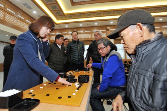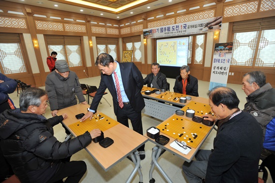 ▲조한승9단 vs 박정환 9단 국수전 도전1국. 중앙 왼쪽부터 심판 백성호 9단, 명예심판 하창환 합천군수