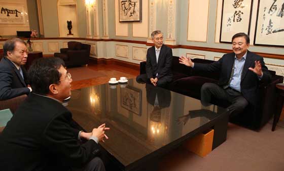▲홍석현 대한바둑협회장과 이의범 국민생활체육 전국바둑연합회장이 두 단체의 통합에 관한 의견을 나누고 있다. 오른쪽부터 시계 방향으로 홍석현 대한바둑협회장, 이의범 국민생활체육 전국바둑연합회장, 박치문 한국기원 부총재, 강영진 대한바둑협회 전무이사 <사진 제공 / 중앙일보>