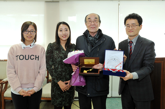 ▲한국기원 양재호 사무총장이 지난 12월 은퇴한 심종식 6단에게 감사패를 증정했다. 왼쪽부터 오유진 2단, 김효정 전임 기사회장, 심종식 6단, 양재호 사무총장