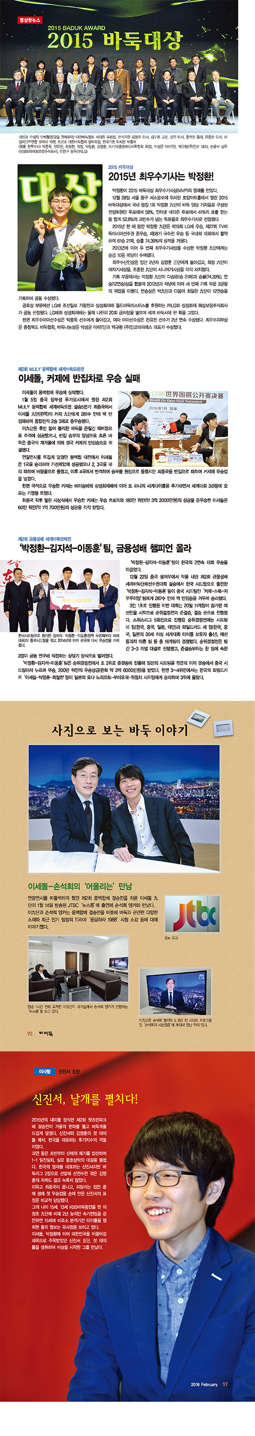 이번호 커버스토리에서는 연말연시를 뜨겁게 달궜던 제2회 MLILY 몽백합배 결승5번기 이세돌과 커제 대결의 시작부터 끝까지를 심도 있게 조명했다. 또한 제2회 렛츠런파크배를 우승하며 한국바둑의 미래에서 황태자로 부상한 신진서를 밀착인터뷰 했다.
