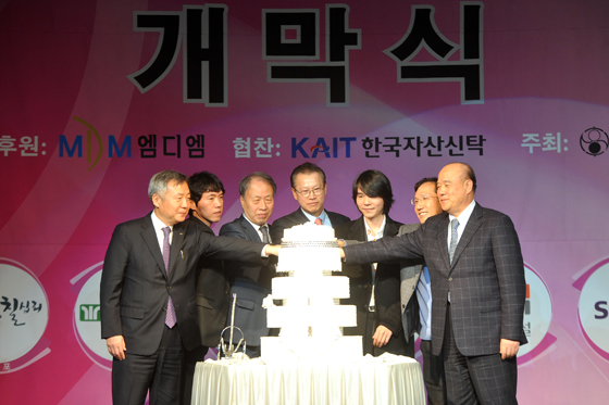 ▲개막 케이크 커팅 장면. 왼쪽부터 협찬사인 한국자산신탁 김규철 대표이사, 이창호 9단, 한국기원 박치문 부총재, 엠디엠 문주현 회장, 이세돌 9단, 한국기원 이의범 이사, 대한바둑협회 안병균 이사