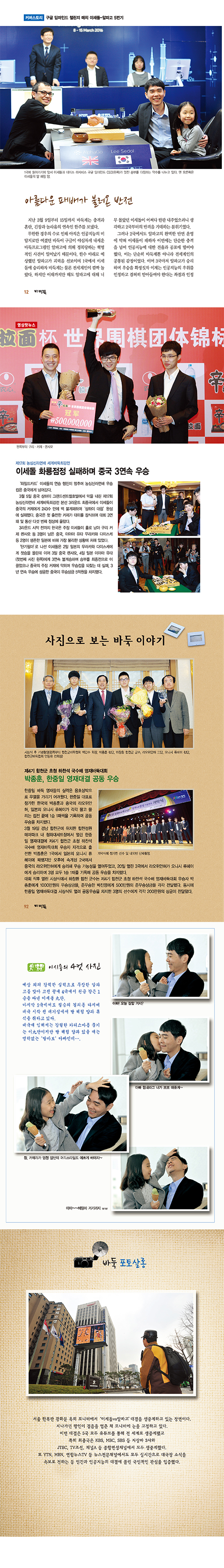 한편 바둑계의 3대 리그 시대를 열어젖힌 시니어바둑리그의 개막과 전망을 비롯해 2회째로 접어든 한국여자바둑리그 4라운드까지의 경과를 조명했고, 이세돌-알파고의 대결에서도 적용됐던 중국바둑룰을 2월호에 이어 2탄으로 집중분석했다.