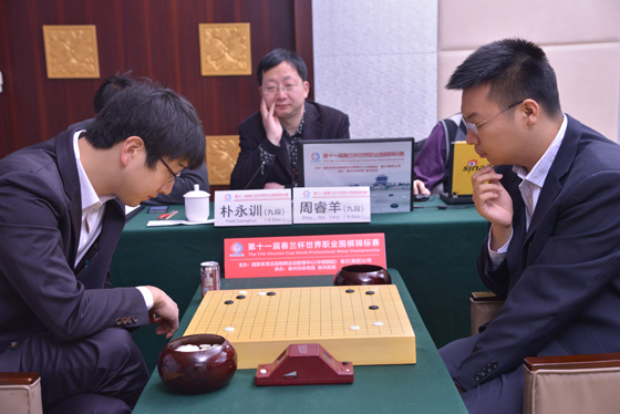 ▲박영훈 9단(왼쪽)이 전기대회 준우승자인 저우루이양 9단을 꺾고 이 대회 첫 8강행을 확정지었다