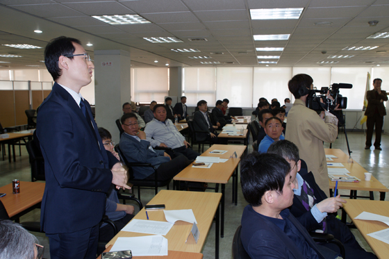 ▲선수선발식에 참가한 충청북도 김만수 감독이 선수 선발에 관한 궁금증을 관계자에게 묻고 있다