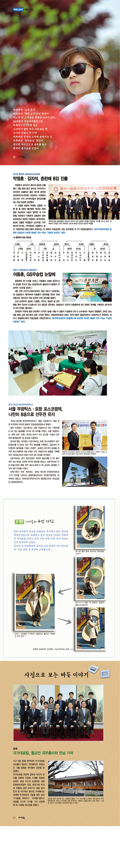 이번호 커버스토리에서는 여자기사 최초로 LG배 통합예선을 거쳐 본선에 진출한 최정 六단의 바둑 이야기를 담았다. 또한 LG배, 춘란배, GS칼텍스배 등 다양한 국내외 대회 소식을 영상화보로 전하고, 중반을 넘어서며 치열한 순위쟁탈전이 한창인 여자리그와 왕년 스타들의 뜨거운 열정의 무대 시니어리그를 종합기사로 다뤘다.