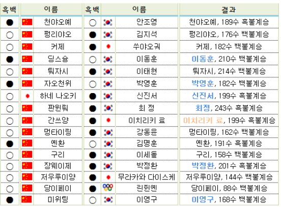 최종 16강 분포는 한국 6명, 중국 9명, 일본 1명이다. 전기 대회에서는 한국이 10명, 중국 4명, 일본과 대만이 각 1명씩 16강에 진출한 바 있다.