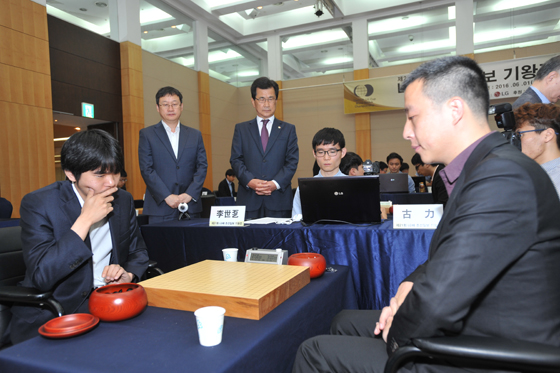 ▲이세돌 9단과 구리 9단의 대결을 이시종 충청북도지사와 유창혁 국가대표 감독이 지켜보고 있다