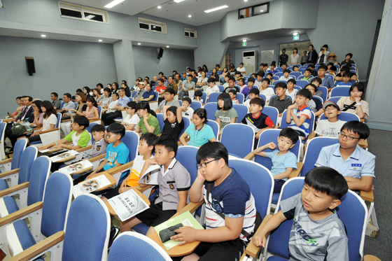 ▲청주 지역 애기가와 어린이들이 청남대를 방문해 김성룡 9단의 공개해설회를 경청하고 있다