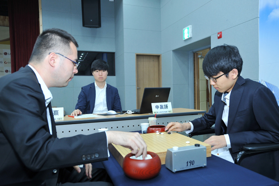 ▲신진서 5단(오른쪽)이 퉈자시 9단에게 승리하며 입단 후 첫 세계대회 8강을 결정지었다