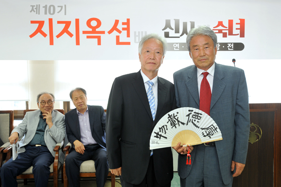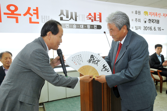 ▲서예가 김창동 선생(위사진 왼쪽)과 양상국 9단(아래사진 왼쪽)이 감사의 마음을 담아 기념품을 전달했다