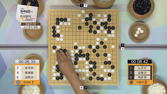 ‘릴레이 대국’으로 열린 1국에서 김정우ㆍ정인규ㆍ송재환 선수가 한팀을 이룬 연세대가 박치문 오경환 김형균 선수가 출전한 서울대를 물리치며 기선을 제압했다. 이어 3대3 대국으로 열린 2국에서 연세대는 유석민ㆍ정재웅ㆍ김현근 선수가 한팀을 이뤄 노근수ㆍ강형근ㆍ최준영 선수가 나선 서울대를 꺾었다.