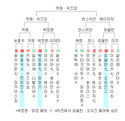 한편 준결승에서 한국의 박정환 9단ㆍ최정 6단 페어는 중국의 커제 9단ㆍ위즈잉 5단 페어에 302수 만에 흑 1집반패, 최철한 9단ㆍ오유진 2단 페어는 대만의 천스위안 9단ㆍ헤이자자 6단 페어에 295수 만에 백 4집반패하며 결승 진출에 실패했다.