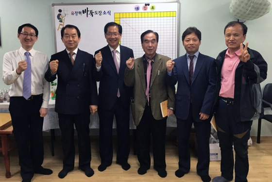 ▲충북 바둑을 이끄는 주역들. 왼쪽부터 김만수 8단, 조기식 충북 바둑협회장, 오제세 국회의원, 길송학 청주시 바둑협회장, 최계성 청주 유창혁 바둑도장 원장, 유재천 청주시 바둑협회 이사