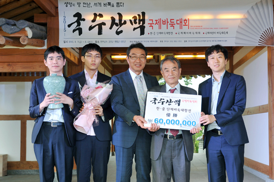 ▲지난해 한ㆍ중 단체바둑대항전에서 우승한 한국팀. 왼쪽부터 이세돌ㆍ박정환 9단, 전라남도 우기종 정무부지사, 김인 국수, 최철한 9단