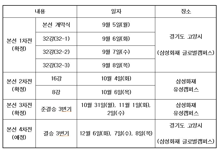 본선 32강에 이어 16강과 8강전은 10월 4일과 6일 삼성화재 유성캠퍼스에서, 준결승 3번기는 10월 31일부터 11월 2일까지 같은 장소에서 속행된다. 결승 3번기는 12월 6∼8일 삼성화재 글로벌캠퍼스에서 열려 21번째 챔피언을 가리게 된다.
