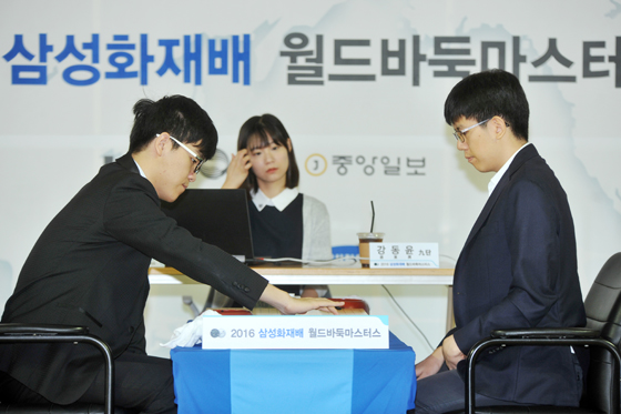 또 강동윤 9단이 ‘디펜딩 챔피언’ 커제 9단에게 208수 만에 백 불계승하며 16강에 합류한데 이어 강승민 5단이 일본의 이다 아쓰시 8단에게 327수 만에 흑 13집반의 대승을 거둬 본인의 두 번째 삼성화재배 16강행을 완성했다. 강승민 5단은 첫날 2013년 이 대회 우승자 탕웨이싱 9단에게 불계승하는 파란을 일으킨 바 있다. ▲강동윤 9단(오른쪽) vs 커제 9단