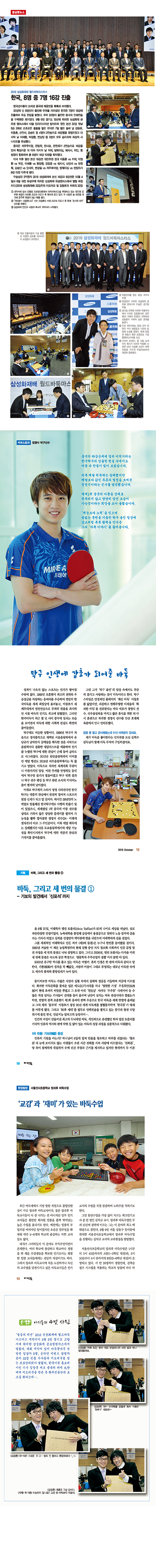 이번호 커버스토리에서는 2016 리우올림픽 탁구 종목에서 멋진 활약을 보여준 정영식 선수의 바둑 이야기를 들려준다. 세계 탁구랭킹 1위 중국의 마룽 선수를 상대로 접전을 펼치며 한국 탁구의 희망을 보여준 정영식 선수의 탁구 올인 일상에 감초처럼 힘이 되어주는 것이 바로 바둑이라고 한다.