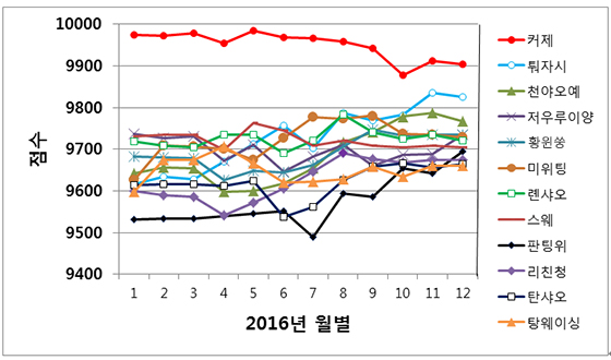 ▲그림 1. 2016년 중국 상위 기사들의 점수 변화그림1에 2016년 중국 상위 기사들의 점수 변화를 그렸다. 커제가 독보적인 것을 볼 수 있지만 최근 들어 점수가 내려가는 추세를 보인다. 퉈자시의 점수가 많이 상승한 것을 볼 수 있다.