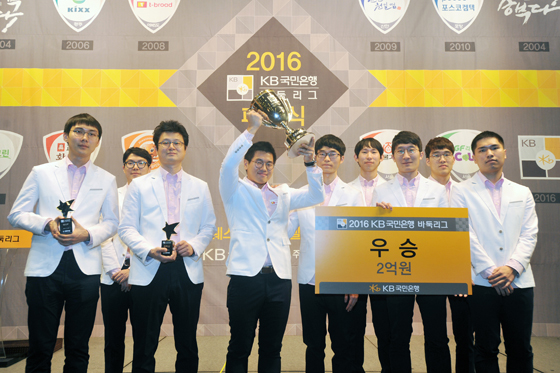 ▲ 티브로드가 2016 KB바둑리그에서 우승하며 3년 연속 우승컵을 들어올렸다