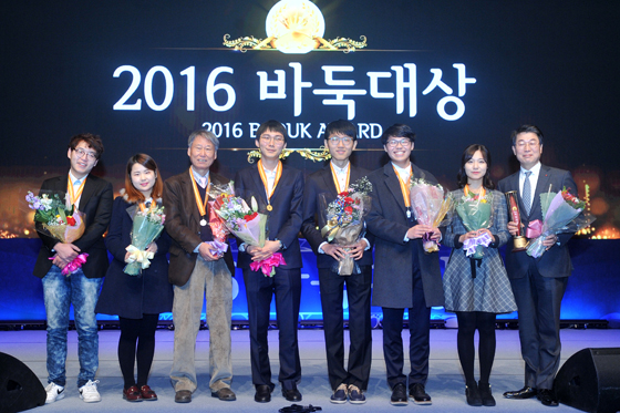 ▲2016 바둑대상 수상자들. (왼쪽부터) 김정훈, 김수영, 서봉수 9단, 박정환 9단,
