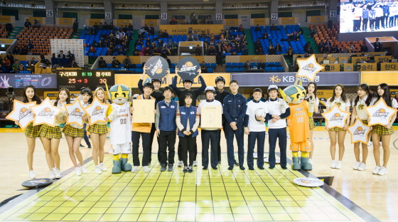 ▲인간알까기 대결을 한 양 팀에게 이창호 9단과 최정 7단의 친필 휘호 바둑판이 증정됐다2쿼터 종료 후 하프타임에는 KB국민은행 신입 행원들과 공군의 인간 알까기 대결이 펼쳐졌으며 양 팀에게는 이창호 9단과 최정 7단의 친필 휘호 바둑판이 기념품으로 증정됐다.