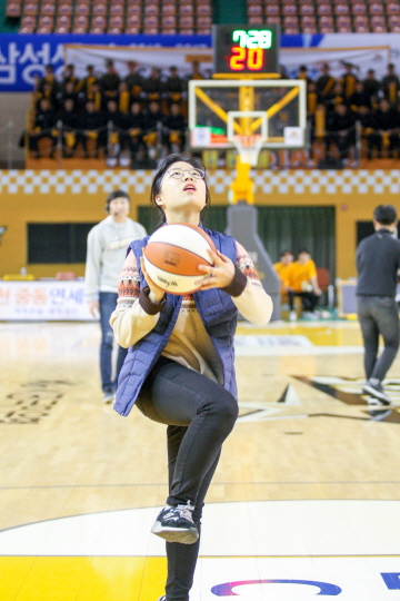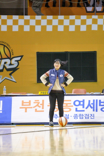 ▲멋진 자세로 골인에 성공한 최정 7단1쿼터 종료 후 휴식시간에는 바둑 상식문제를 맞춘 관중에게 선물이 주어졌다. 2쿼터 중간 정규 작전타임에는 최정 7단이 KB스타즈 팬과의 스피드슛 대결에서 승리해 경품을 획득하기도 했다.
