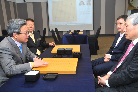 ▲채인석 화성시장(왼쪽)과 조훈현 의원, 유창혁 한국기원 사무총장이 바둑회관 등 상호 현안에 관해 논의했다. 왼쪽부터 시계방향으로 채인석 화성시장, 박상돈 심판, 유창혁 한국기원 사무총장, 조훈현 의원