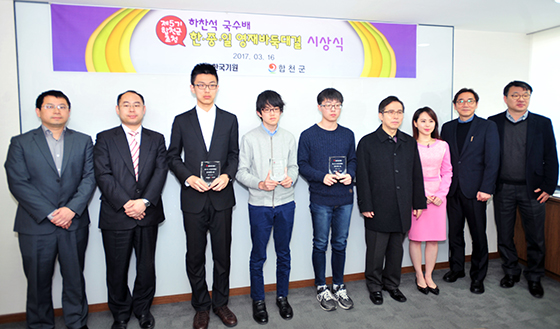 ▲대국 후 진행된 시상식에서 중국 쉬자양 5단(왼쪽 3번째)와 일본 히로세 유이치 초단(왼쪽 4번째),