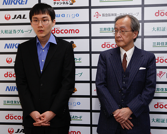 ▲박정환 9단(왼쪽)과 딥젠고 개발자 가토 히데키 씨가 종국 후 프레스센터에서 기자들과 인터뷰를 가졌다 경기 후 인터뷰에서 박정환 9단은 “초반은 나쁘지 않았는데 들여다봤을 때(흑27) 받지 않는 것을 예상 못했고 우변에서 실리를 차지한 것이 대완착이었다”면서 “특히 좌변에서 붙인 수(백44)가 좋은 수여서 흐름이 완전히 깨졌고 일방적인 흐름이었다. 바둑 인공지능한테 많은 수법을 배워 의미 있는 대국이었다”고 말했다. 이어 박9단은 “운 좋게 2승을 한만큼 마지막 대국에서 승리해 우승할 수 있도록 잘 준비하겠다”고 덧붙였다.
