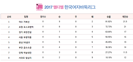 8개팀이 출전한 2017 엠디엠 한국여자바둑리그가 정규리그 14경기 중 11경기를 마친 현재 1위부터 8위까지 순위간 승수가 모두 1승 차이를 보여 치열한 순위싸움을 예고하고 있다.