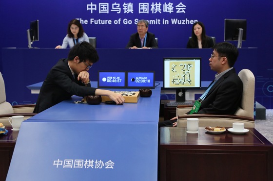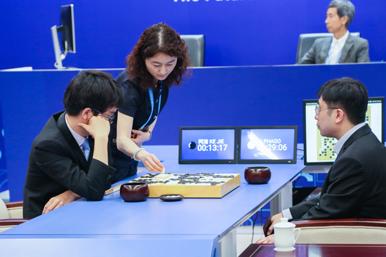 ▲커제 9단(왼쪽)과 알파고의 계가 장면. 오른쪽은 알파고의 대리인 아자황 박사