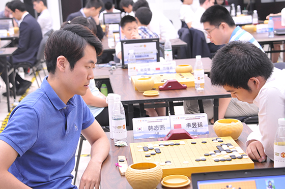 ▲한태희 6단(왼쪽)이 중국 미위팅 9단에 265수 만에 흑 5.5집승했다