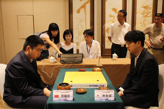 국내랭킹 1위 박정환 9단은 24일 같은 장소에서 열린 16강전에서 중국랭킹 1위인 커제(柯潔) 9단에 320수 만에 백 2집반승을 거두며 최대 고비를 넘긴 데 이어 처음 대결한 천쯔젠 5단에게도 승리하며 2년 만의 세계대회 우승에 한 발 다가섰다.