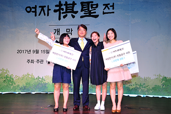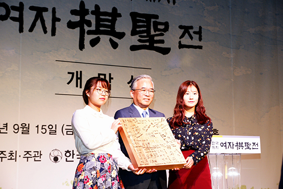 ▲ 여자기사들은 단재완 해성그룹 회장에게 참가선수들의 휘호가 담긴 바둑판을 감사 선물로 전달했다