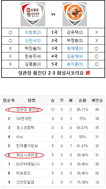 ‘추석 혈전’에서 화성시코리요가 1위 정관장황진단을 3-2로 물리쳤다.