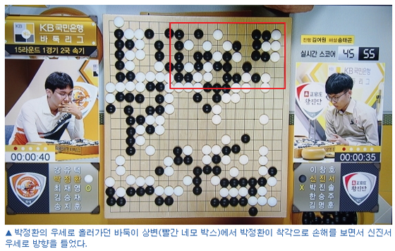 바둑이 끝나갈 즈음 튀어나온 신진서의 끝내기 실수가 승부를 급작스럽게 혼돈으로 몰고 갔다. 신진서의 1집반 승리가 확실해 보였던 상황에서 졸지에 알 수 없는 반집 승부. 과연 누가 이길지를 놓고 의견이 분분한 가운데 박정환의 반집승을 말하는 기사들의 수가 점점 늘어나기 시작했다.