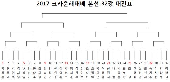 2017 크라운해태배는 내달 8일 나현 8단과 신진서 8단의 대결을 시작으로 2개월간 본선 레이스에 돌입한다. 32강과 16강은 매주 금ㆍ토ㆍ일요일 저녁 6시 30분과 8시 30분에, 8강부터 결승까지는 매주 토ㆍ일 저녁 6시 30분에 바둑TV를 통해 생중계된다.