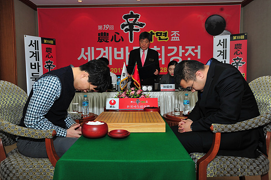▲ 대국 전 마주 앉은 두 기사. 한상렬 심판의 대국 개시 선언으로 돌을 가린 결과 신민준 6단의 백번이 결정됐다.