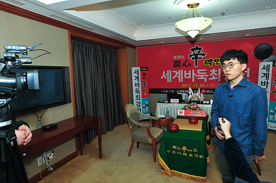 ▲ "당이페이 9단과는 공식 대국은 처음이지만 인터넷에서 많이 둬봤습니다. 극단적인 실리파고 수비적인 기사라고 생각합니다. 내일 바둑을 전투로 이끌 수 있다면 제가 유리할 것 같습니다."(신민준 6단)